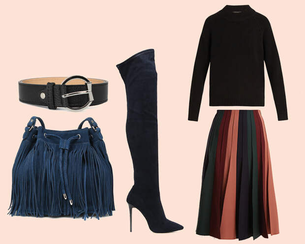 Нарядные ботфорты на каблуках из замши — база как для особенных случаев, так и для рабочих будней. В компании с плиссированной миди-юбкой, глухим свитером свободного силуэта и широким ремнем ботфорты можно надеть даже в офис или на учебу.