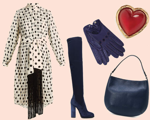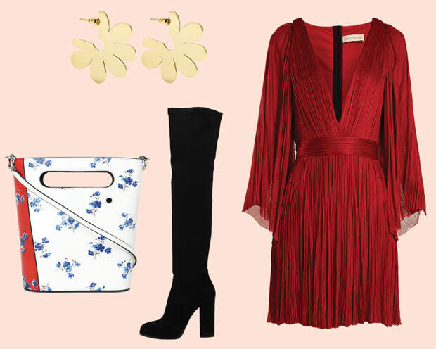 Практически любое необычное платье длины миди или макси можно уверенно рифмовать с замшевыми ботфортами. Самое важное тут — минимум декора на самих сапогах. Классическая модель темного цвета сработает на «отлично». Зато что касается сумки, то стоит сделать ставку на какой-то необычный дизайн. Например, трехцветный тоут на длинной ручке с рисунком, напоминающим нежную гжель, — классное дополнение для авангардного и яркого образа.